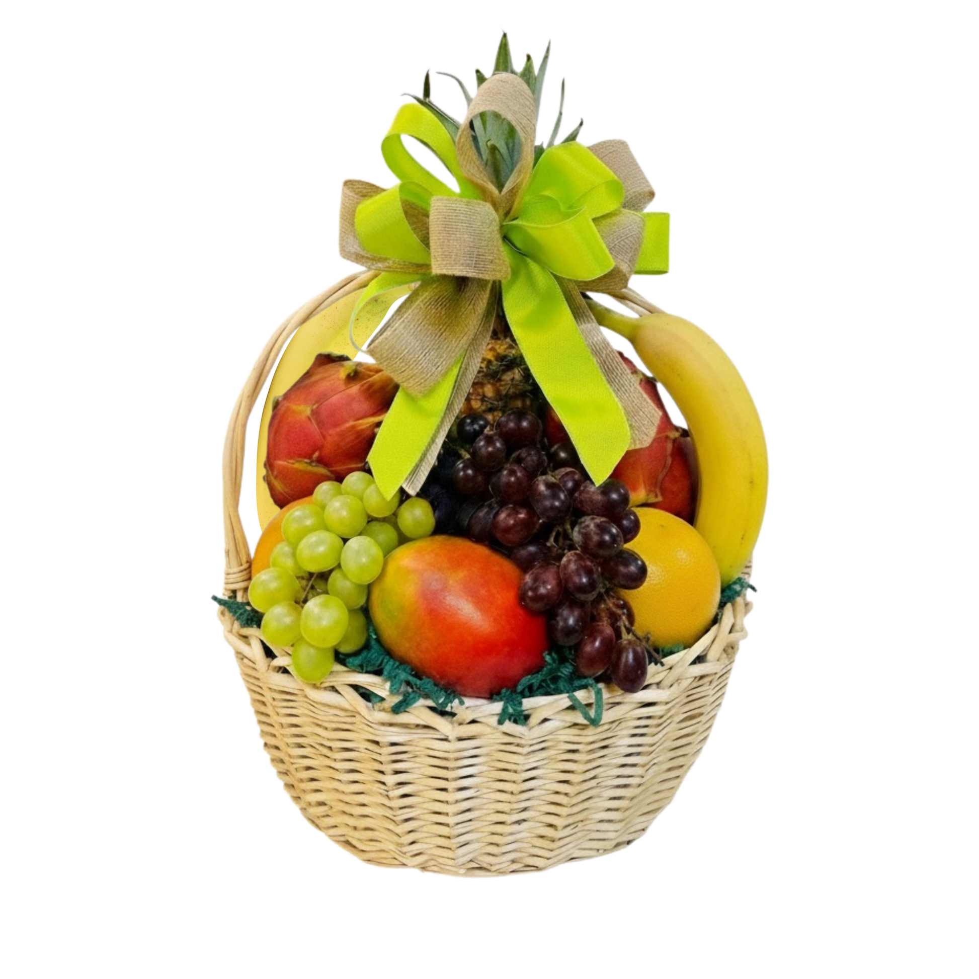 This beautifully arranged tropical fruit basket features show-stopping favorites like fiery red dragon fruit, juicy mango, tall-crowned pineapple, sweet bananas, crisp ruby red grapefruit, and clusters of red and green grapes.