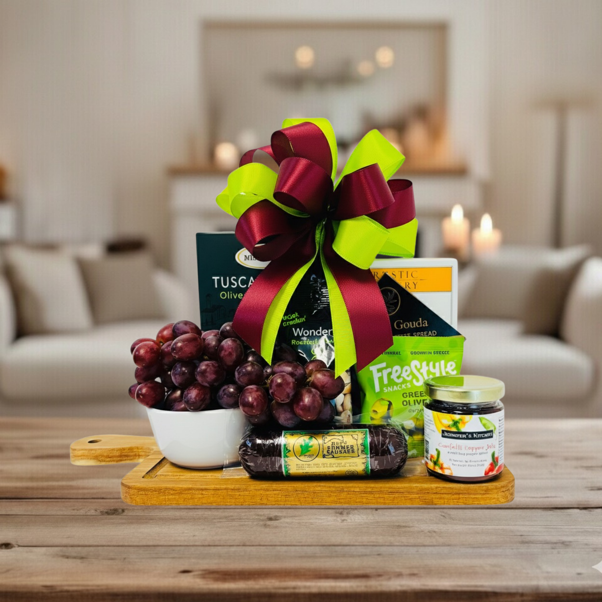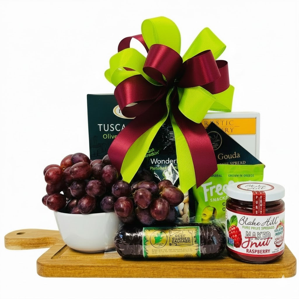 Indulge in The Charcuterie Board Experience a beautifully curated mix of sweet and savory bites, artfully arranged on a wooden serving board. This elegant gift includes premium summer sausage, smoked gouda cheese spread, Dolcetto Tuscan crisps, roasted pistachios, marinated Greek olives, Blake Hill Preserves Naked Raspberry Jam, and a generous bunch of fresh red grapes.