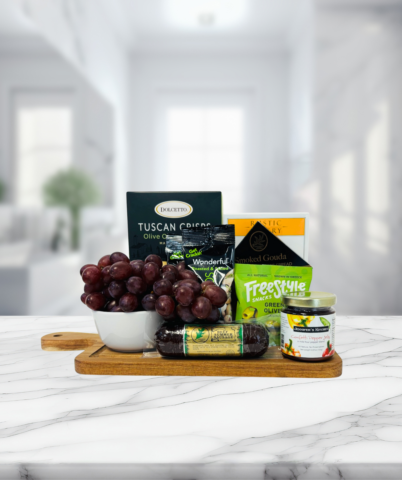 Indulge in The Charcuterie Board Experience a beautifully curated mix of sweet and savory bites, artfully arranged on a wooden serving board. This elegant gift includes premium summer sausage, smoked gouda cheese spread, Dolcetto Tuscan crisps, roasted pistachios, marinated Greek olives, Jennifer’s Kitchens confetti pepper jelly, and a generous bunch of fresh red grapes.